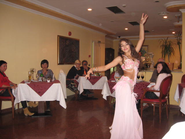 Throughout the evening we listened to traditional Lebanese music, which added so much to the festive mood. Then, much to our surprise, a lovely belly dancer came out to perform for us. I have seen professional belly dancing before – I’ve even taken a few classes – but this woman was far superior to anyone I’ve ever seen. Her shimmy was electric, and I still seriously ponder whether or not she had batteries in her skirts! She performed three separate dances in three different costumes, and each time the crowd was wowed by her masterful dancing. After she finished, the music played on, and Henry and Cecile braved the dance floor. Moments later, Chef Hassan, Jasmine and I joined them, while Katie took pictures (unfortunately, Aliya had already departed). Everyone applauded, as we attempted our own version of belly dancing.