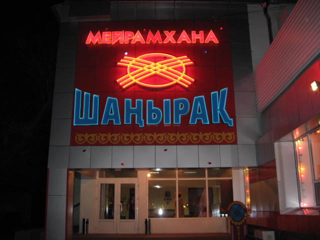 Tonight Aliya, several of my adoption friends and I went to Shangyrak, a nearby restaurant for a traditional Kazakh meal. There were ten of us in our own private room (Aliya masterfully arranged everything!), and we had a wonderful time trying all the different foods, including horse meat, shubat (fermented camel’s milk), kumys (fermented mare’s milk), and beshkarmak (five fingers). I had to spit my first bite of horse meat into a napkin, though I tried to be ladylike about it. It was terribly gamey. The second bite, which was from a different cut, actually tasted O.K., but the thought of eating horse still freaked me out (Note: the second bite was the last bite). As for the camel and mare’s milk, this is an acquired taste I don’t think I’ll acquire in my lifetime. Both types of milk are very bitter and have a strong aftertaste. The closest thing I can compare them to is butter milk. “Five fingers” is a dish with chunks of meat, potatoes, onions and large noodles, and its name reflects the way in which it’s eaten. You simply dig in with all five fingers. I did this at first, but then switched to a fork, as it seemed a bit neater. I really enjoyed this dish and even had a second helping.
